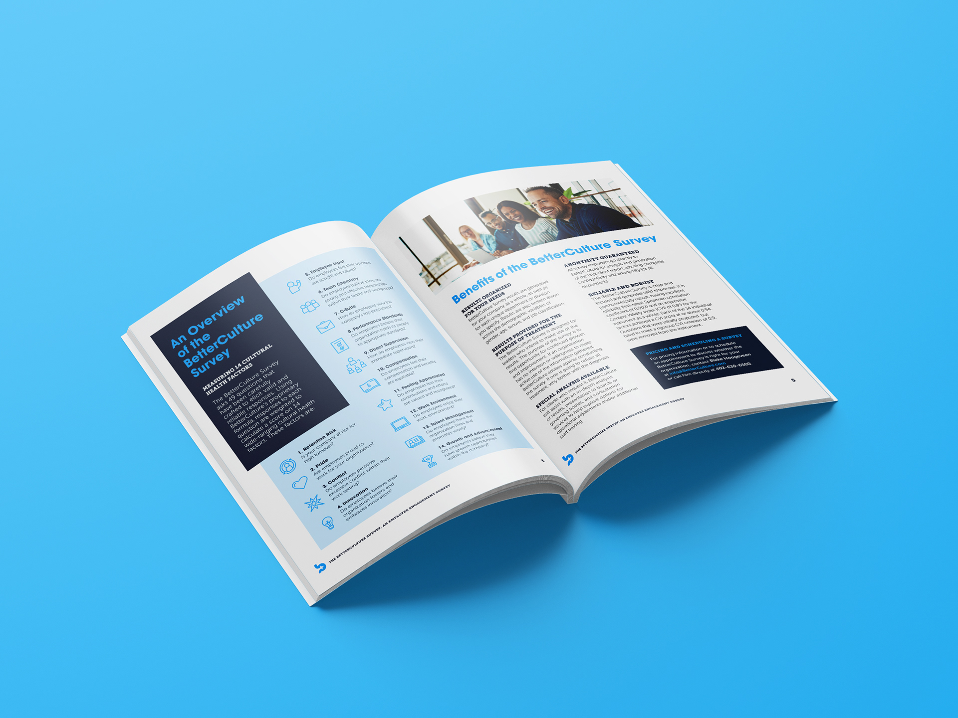 This is a booklet design for The BetterCulture Survey; an in-depth example of the culture, leadership, and analytics BetterCulture brings to their clients.