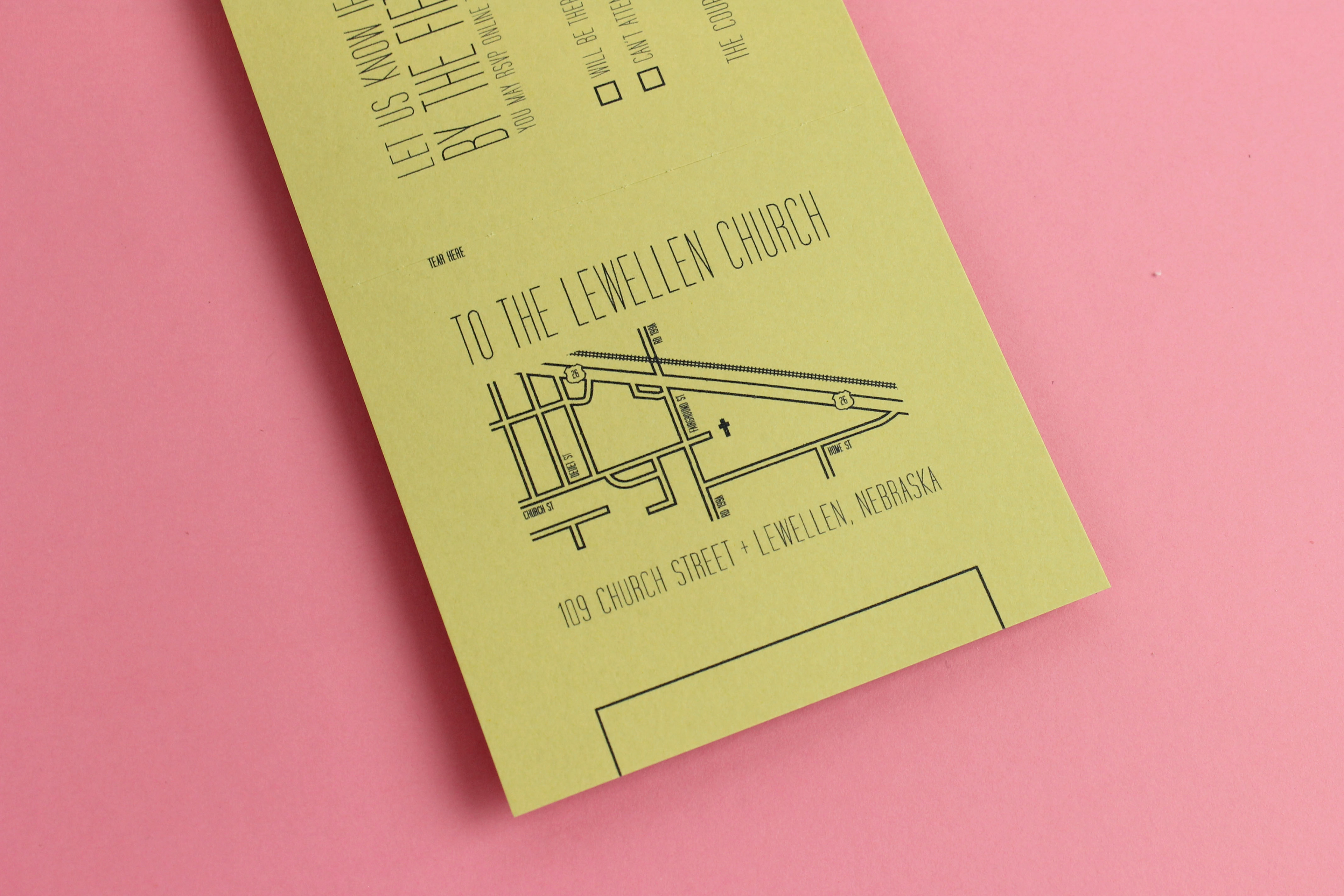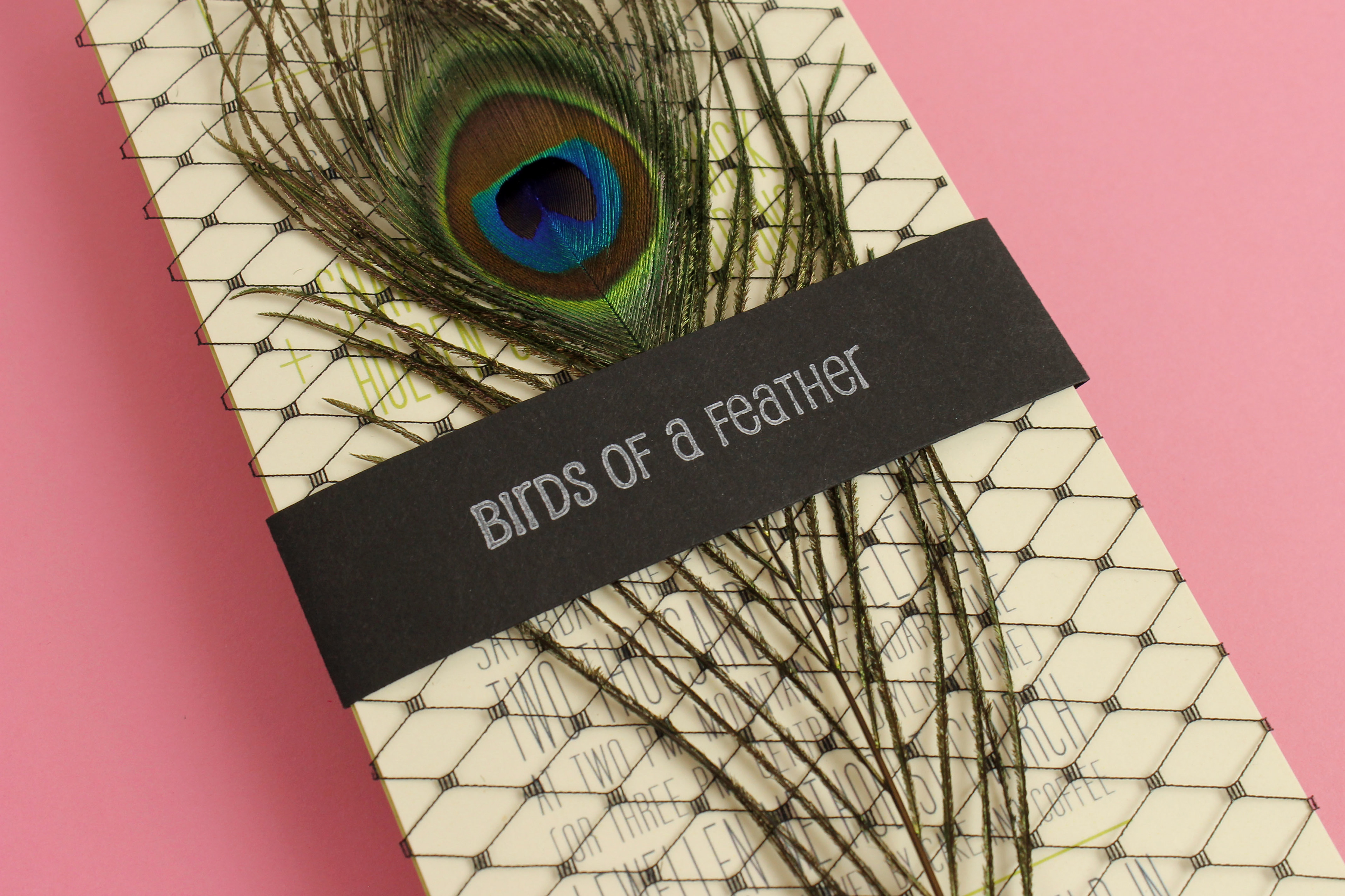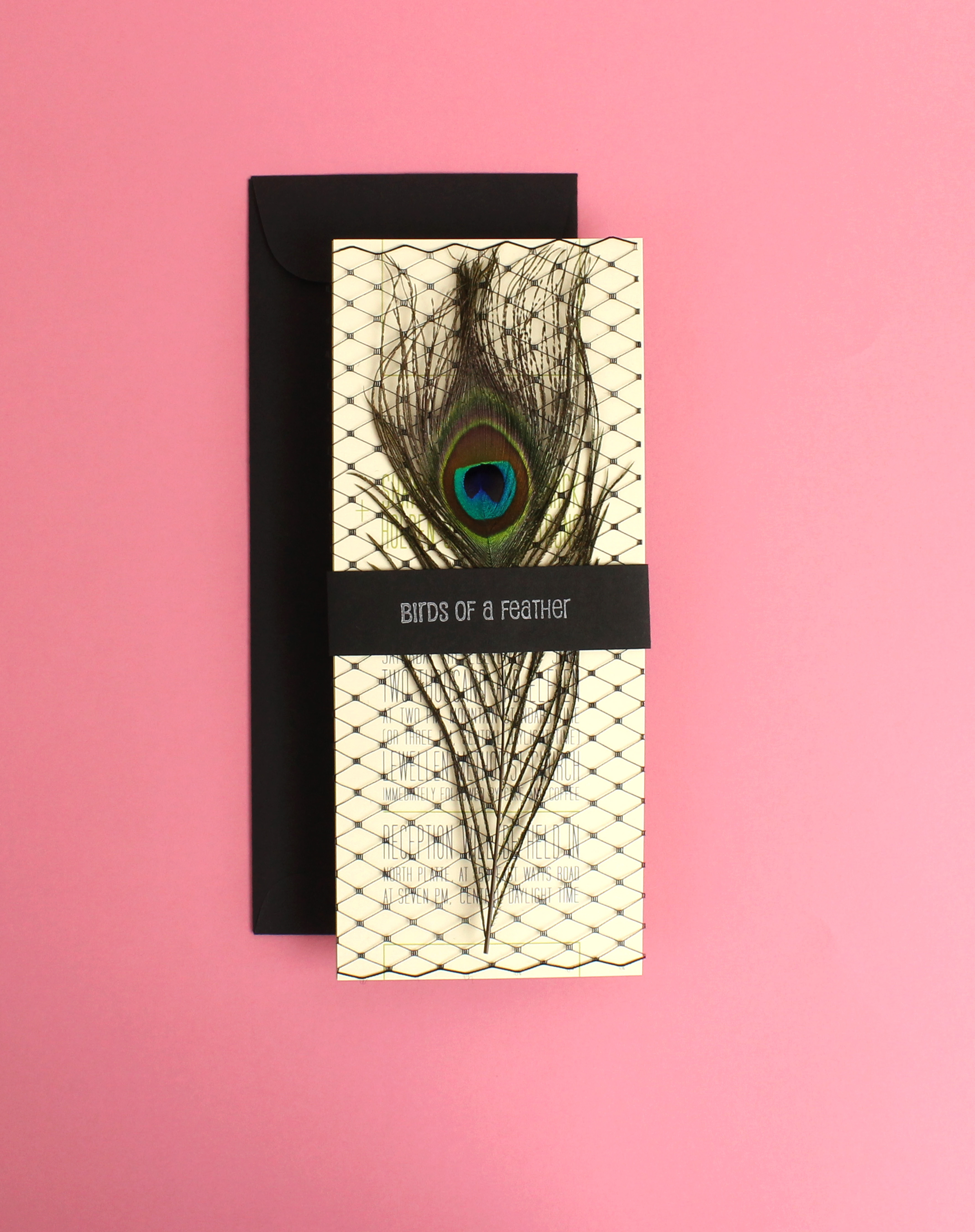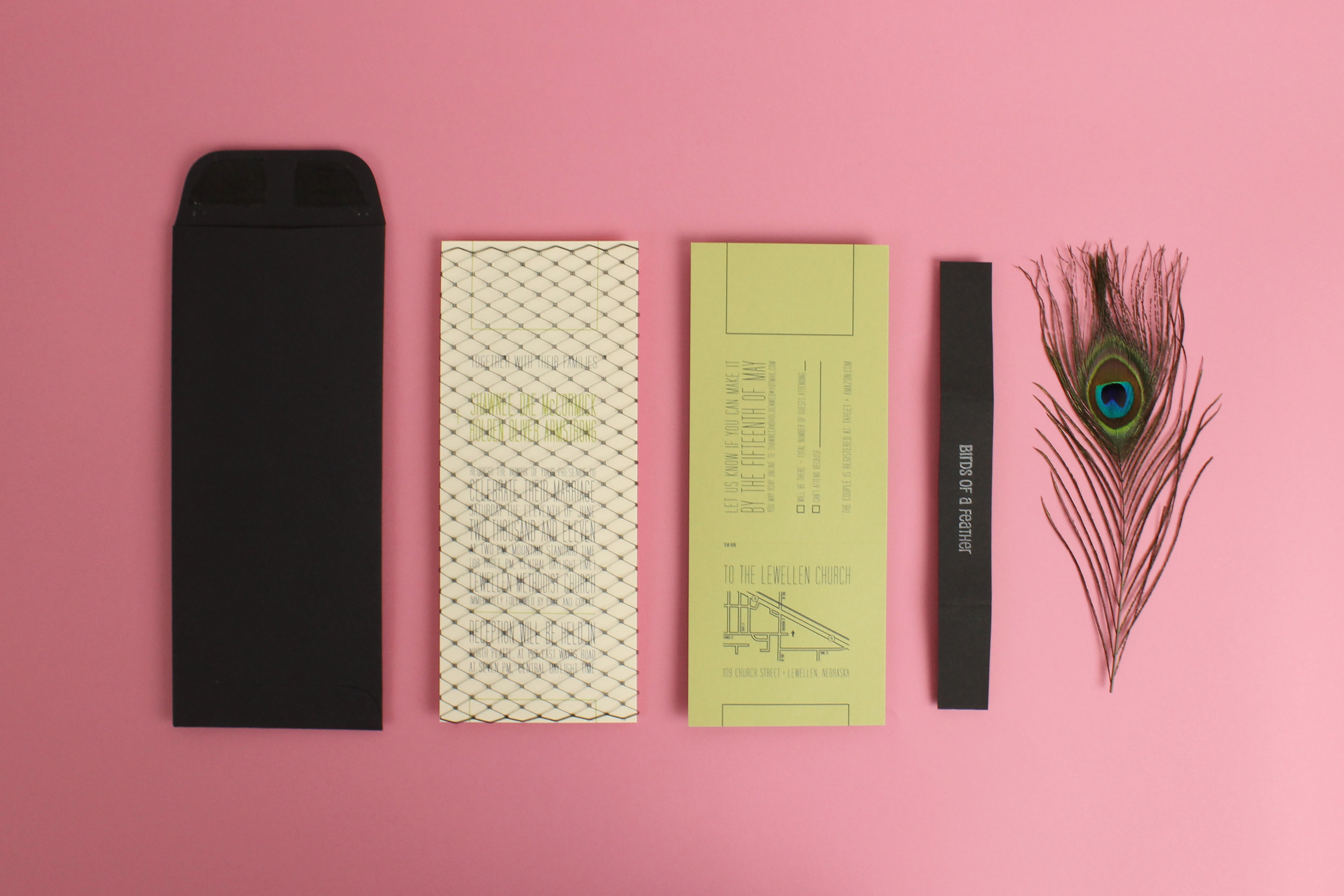 A wedding invitation created for Holden and Shawnee Armstrong. The design was driven by their peacock theme, with green and black colors and a take-away feather that was sent with each invite. "Birds of a Feather" is stamped on a belly band in white ink. Veil netting is an added layer to help tie to the classic wedding feel. The white paper is plike (plastic-like, and almost feels like smooth velvet). The RSVP is attached to a tear away map. The map was meant to be able to fit easily into a wallet for use on the wedding day.