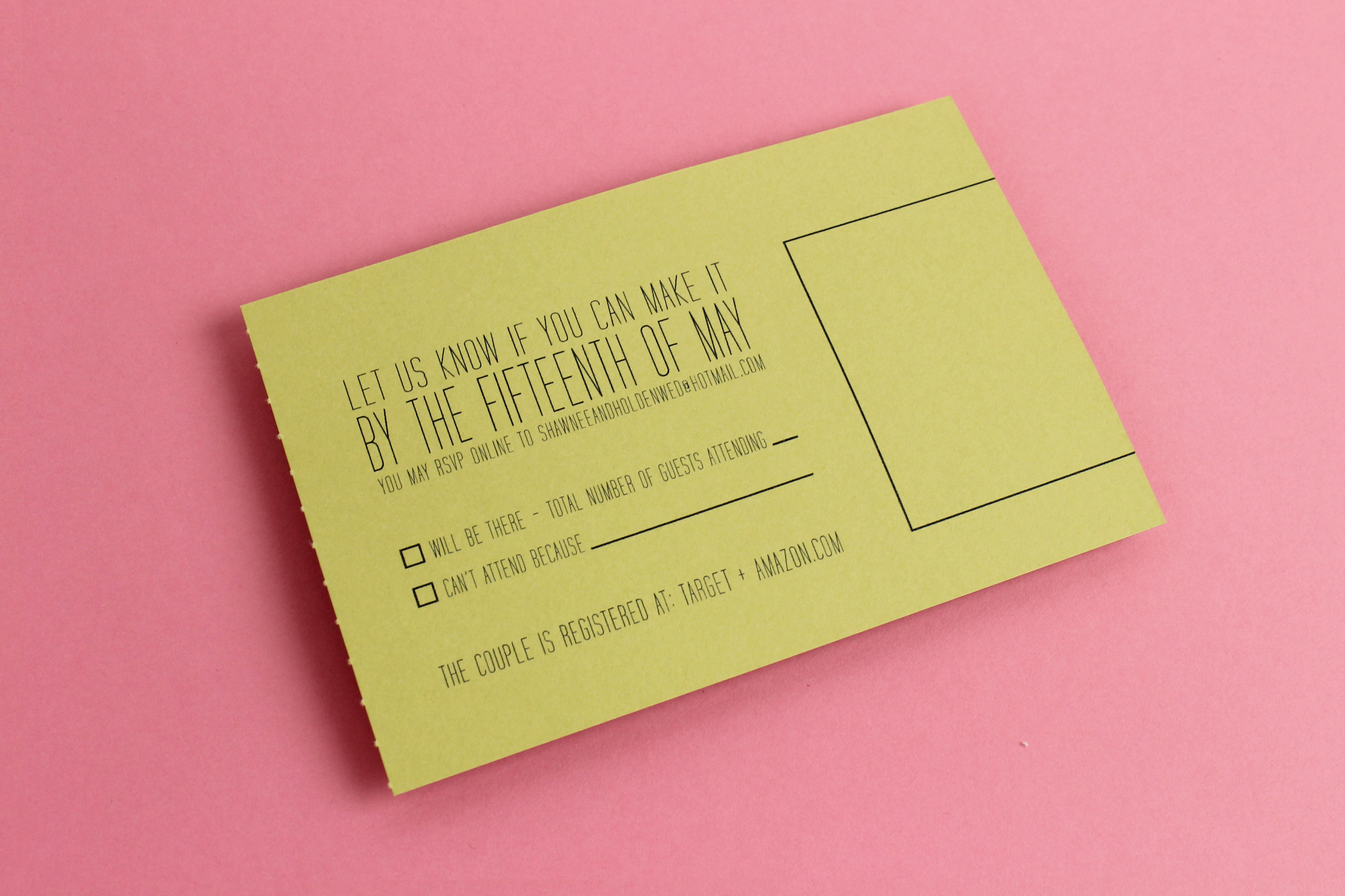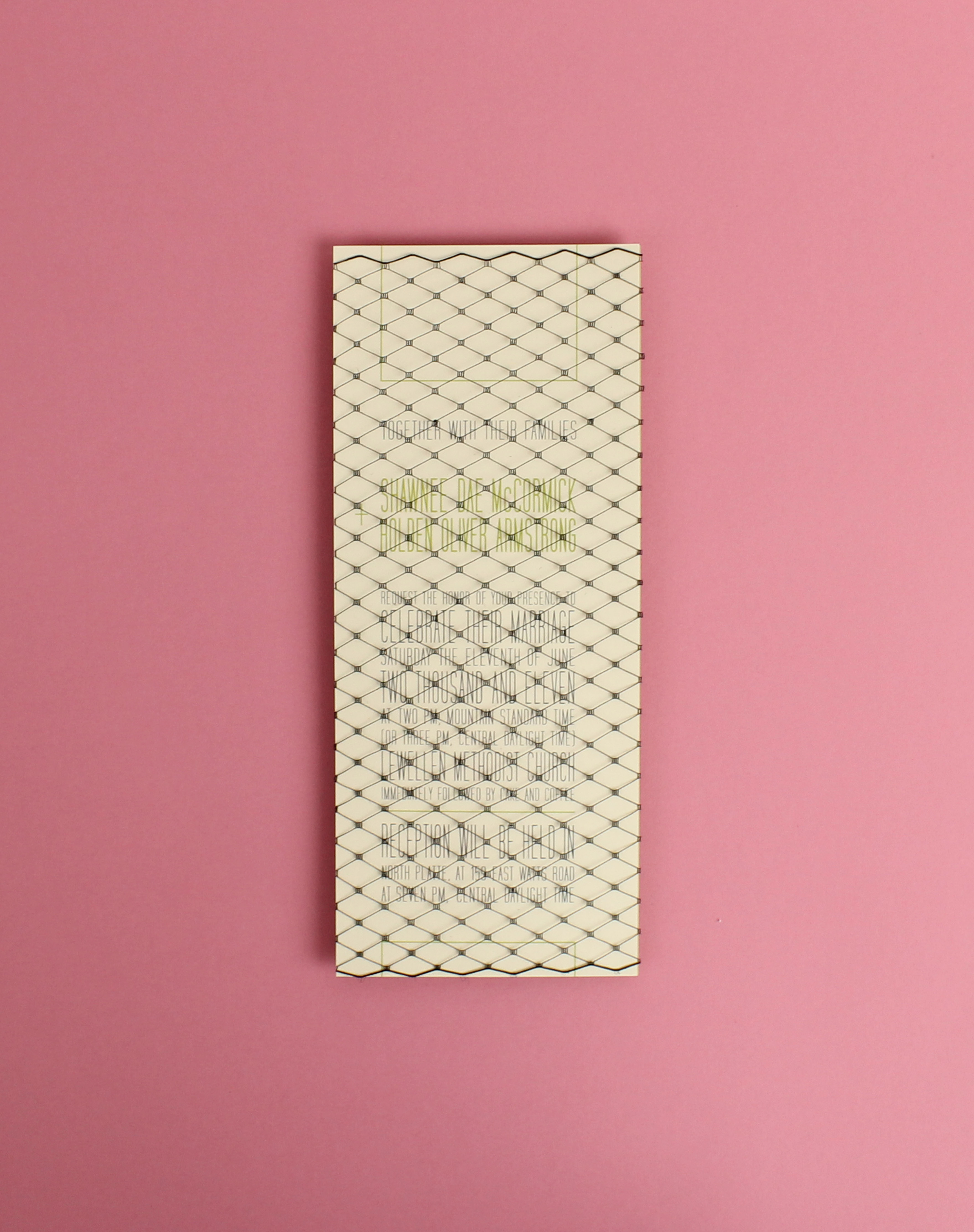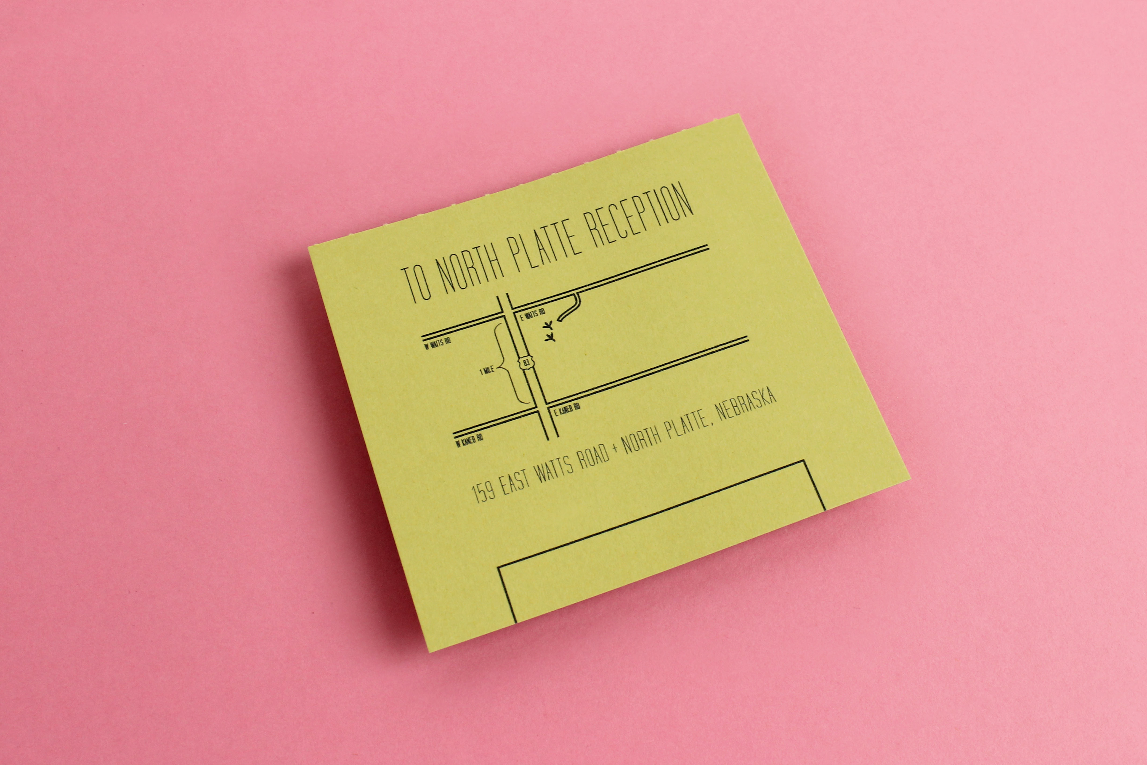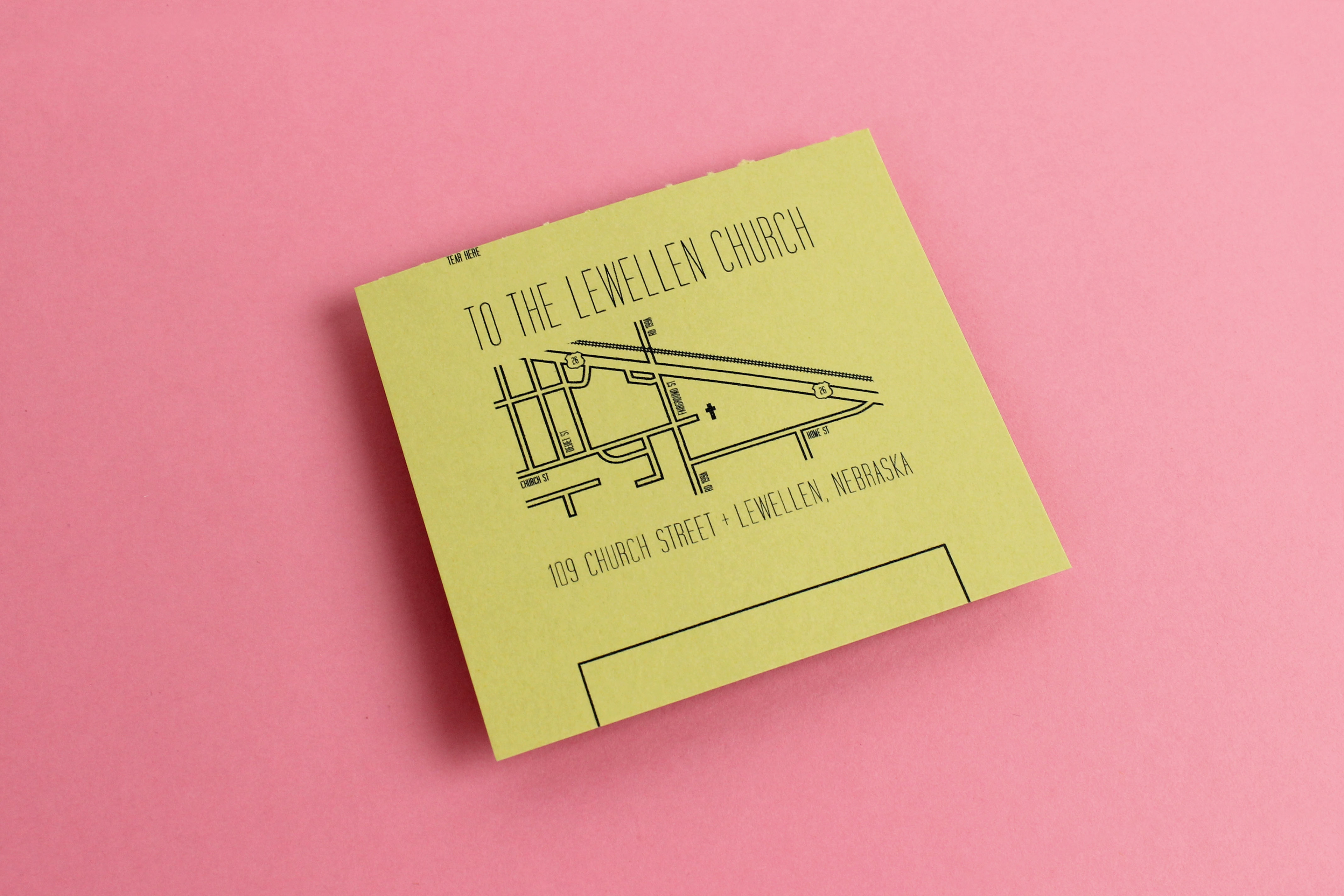 A wedding invitation created for Holden and Shawnee Armstrong. The design was driven by their peacock theme, with green and black colors and a take-away feather that was sent with each invite. "Birds of a Feather" is stamped on a belly band in white ink. Veil netting is an added layer to help tie to the classic wedding feel. The white paper is plike (plastic-like, and almost feels like smooth velvet). The RSVP is attached to a tear away map. The map was meant to be able to fit easily into a wallet for use on the wedding day.