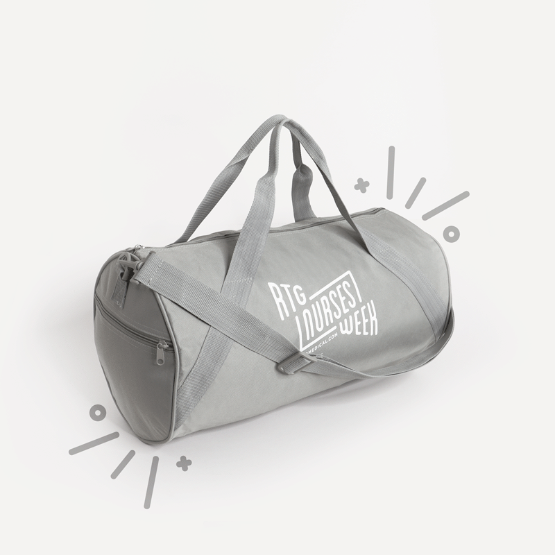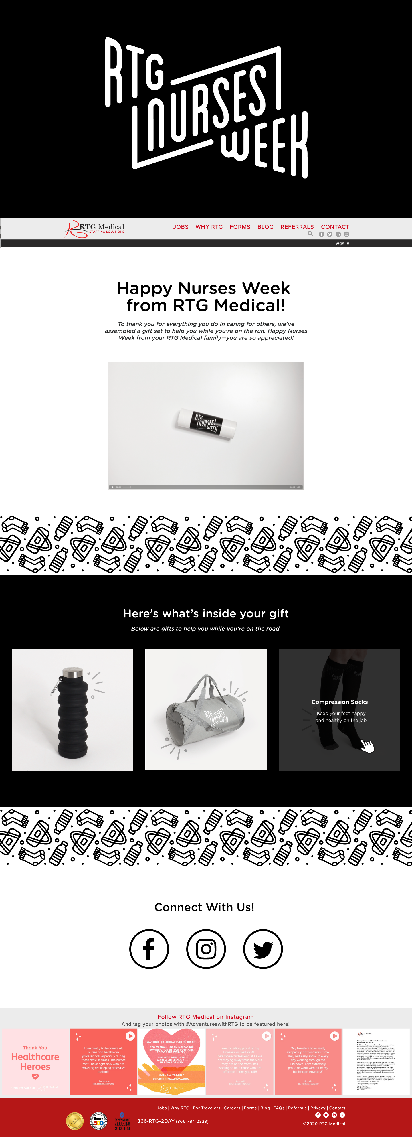 To kick off 2020's Nurses Week, I designed and produced gifts to send to RTG Medical's traveling nurses centered around the theme of "Nurse On The Run." Each gift set included a sports duffel bag, collapsible water bottle, and compression socks. Hundreds were sent out to the medical professionals contracted with RTG across the United States.