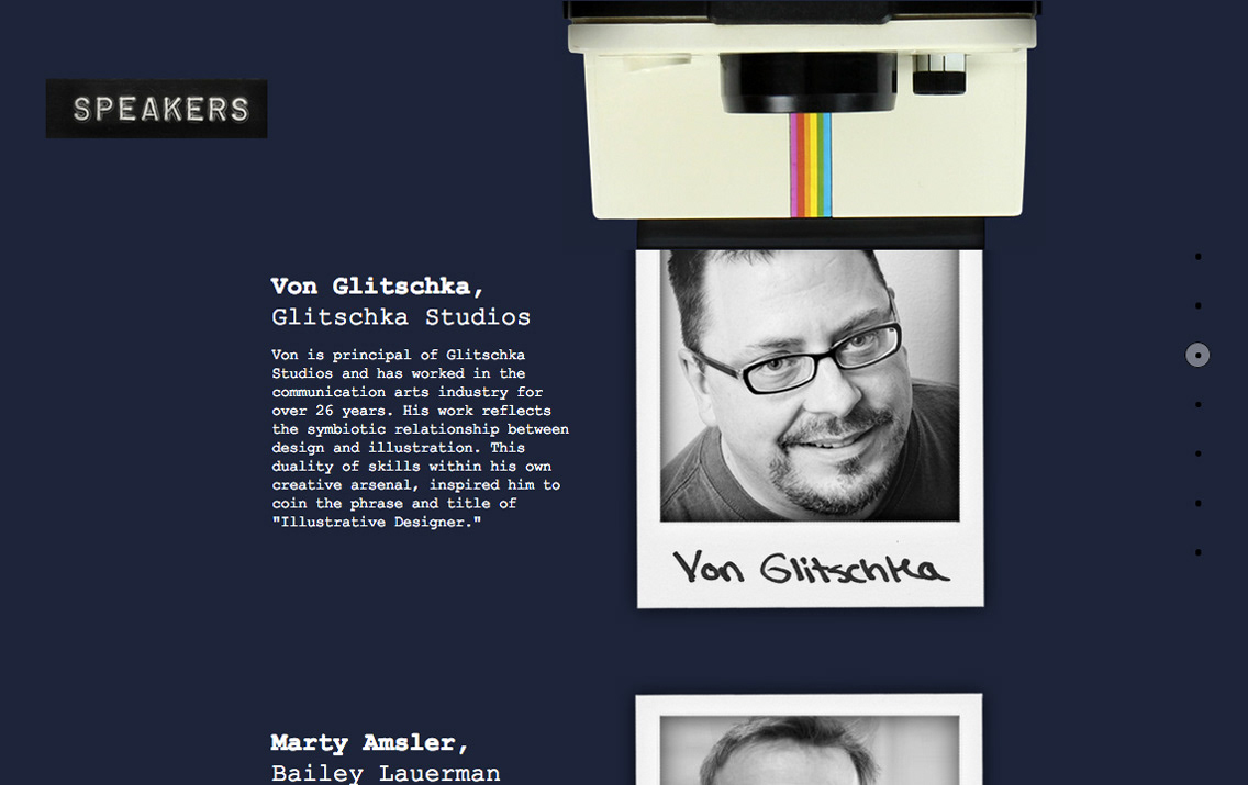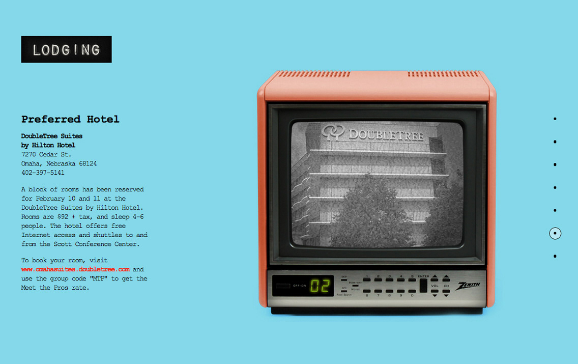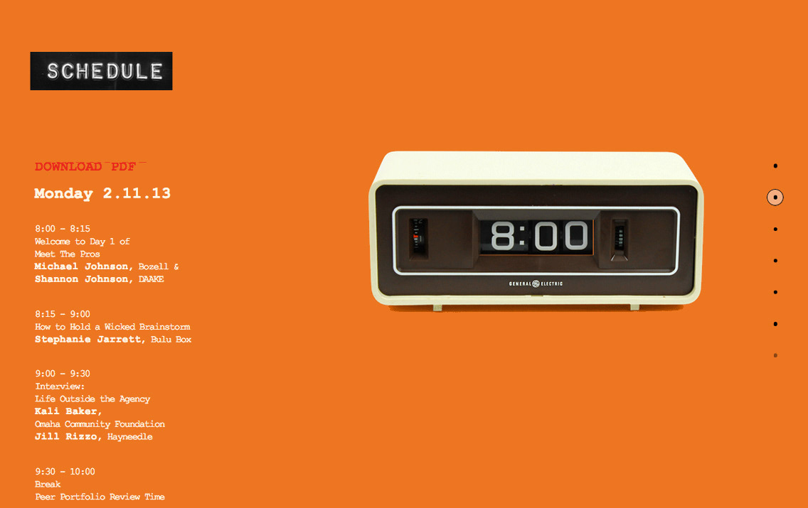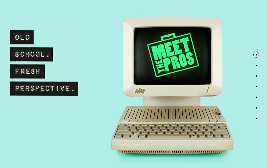 Meet the Pros is a two-day interactive experience designed to give students insight into the world of advertising, from finding a job to the latest industry trends. This responsive site uses an on-scroll parallax effect, creating playful, yet functional interactions between the original photography and the user. For instance, the "Schedule" page features a clock that changes time when the user scrolls to match the information to the left of it. The overall idea behind the aesthetics of this site was to create a connection between the targeted demographic (graphic designers, copywriters, account executives, and students studying to become them) and the first tools their predecessors had once used. A sort of "Old-School" play on copy and photography to tie it all together. Some of the type on this site was created using a vintage label-maker. The dynamic text resembles a typewriter font. Even the colors fields and over-saturation of the photography props harken back to the days when advertising and design began.